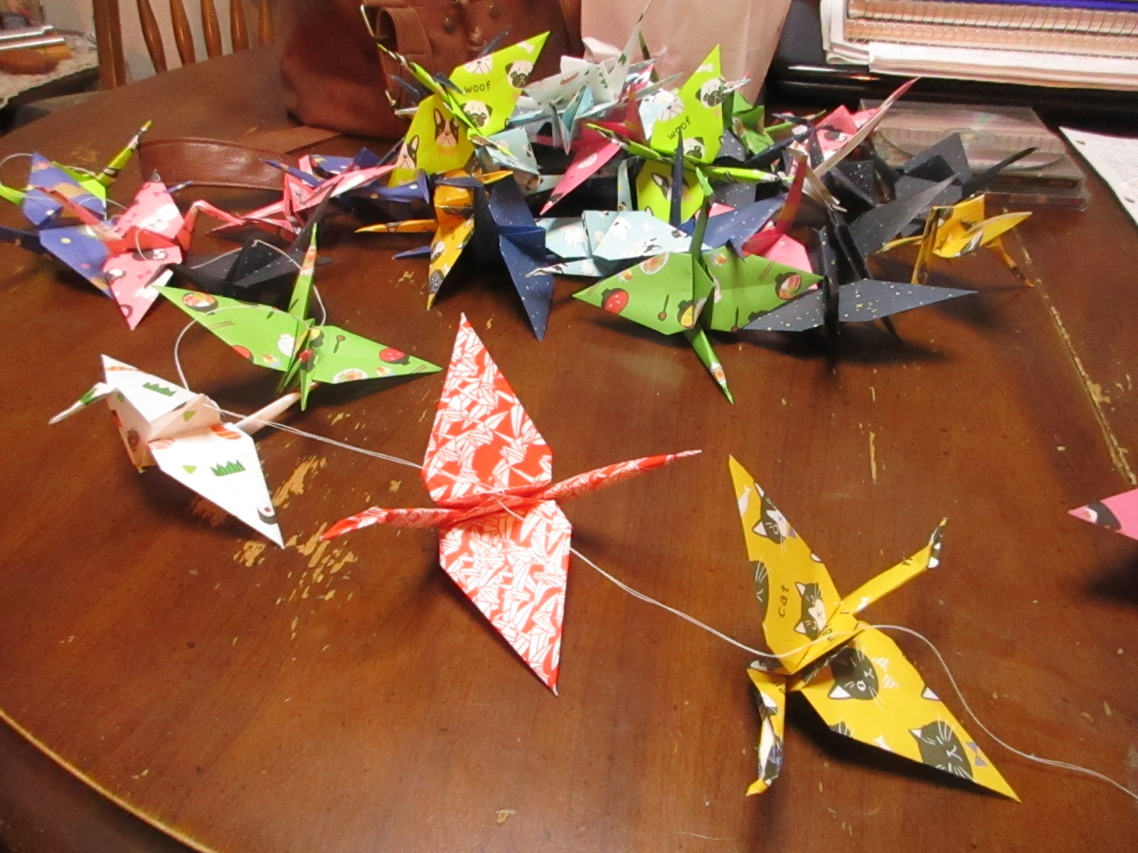 A few months ago I learned how to make origami cranes, and I got on a roll! In Japan, for special occasions it's customary to make long strands of a thousand cranes strung on top of each other. It's pretty, but I'm not going to make a thousand! Haha! Instead I made 130 of them, strung them horizontally and hung them around the house! Gives some color to these white walls.
